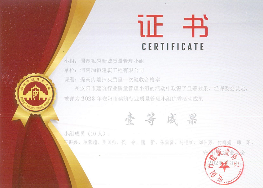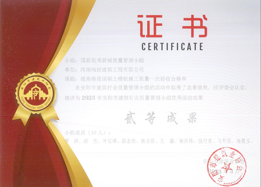 近日,公司國泰瓴秀新城項目申報的《提高樓層混凝土樓板施工質量一次驗收合格率》和《提高內墻抹灰質量一次驗收合格率》兩項QC成果榮獲2023年度安陽市建筑行業(yè)質量管理小組優(yōu)秀活動成果。